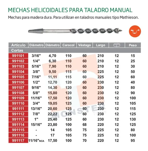 Para perforaciones con taladro manual tipo Mathieson para maderas duras.