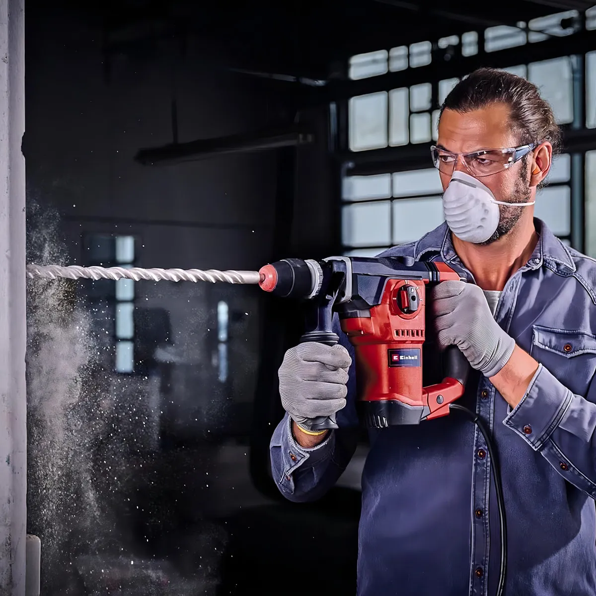 El martillo perforador TE-RH 32-1600 4F de Einhell mecaniza con cuatro funciones potentemente los materiales más distintos: a través de un interruptor de función puede seleccionarse entre perforación, perforación con impacto y cincelado con y sin fijación. El mecanismo percutor neumático garantiza una propulsión ideal, tanto para trabajos de escopleado y demolición o también para taladrar, por ejemplo, en el hormigón o la piedra. Con electrónica de velocidad, 1600 W y una intensidad de impacto de 4,5 Joule, el equipo aporta así mucha potencia y trabajo justo en el punto. Con el cable de 3 m permite así suficiente espacio para mucha libertad de movimiento. El tope de profundidad de perforación ajustable sin escalones es de material macizo - justo como el engranaje. El robusto portaherramientas SDS-plus, con mecanismo semiautomático, garantiza un cambio de herramienta rápido y sencillo. La empuñadura amortiguada a oscilaciones con superficie de agarre suave se complementa por una empuñadura adicional con estriado. Así el equipo puede guiarse de forma precisa, también en condiciones difíciles. El martillo perforador TE-RH 32-1600 4F de Einhell se suministra con un practico maletín de transporte y almacenamiento.