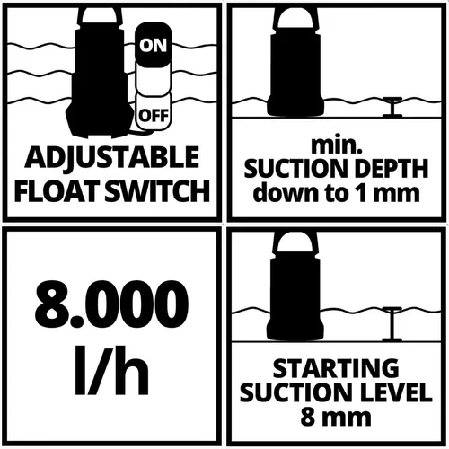 - Sumergible de bajo nivel hasta 1 mm de nivel de agua residual
